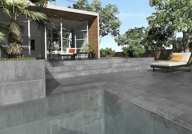 Porcelánico efecto piedra-cemento. En formatos 60x120 y 33x67. Clase 3 antislip. Dispone de peldaño recto 120x33, borde de piscina skimmer, borde de piscina desbordante y rejillas.
