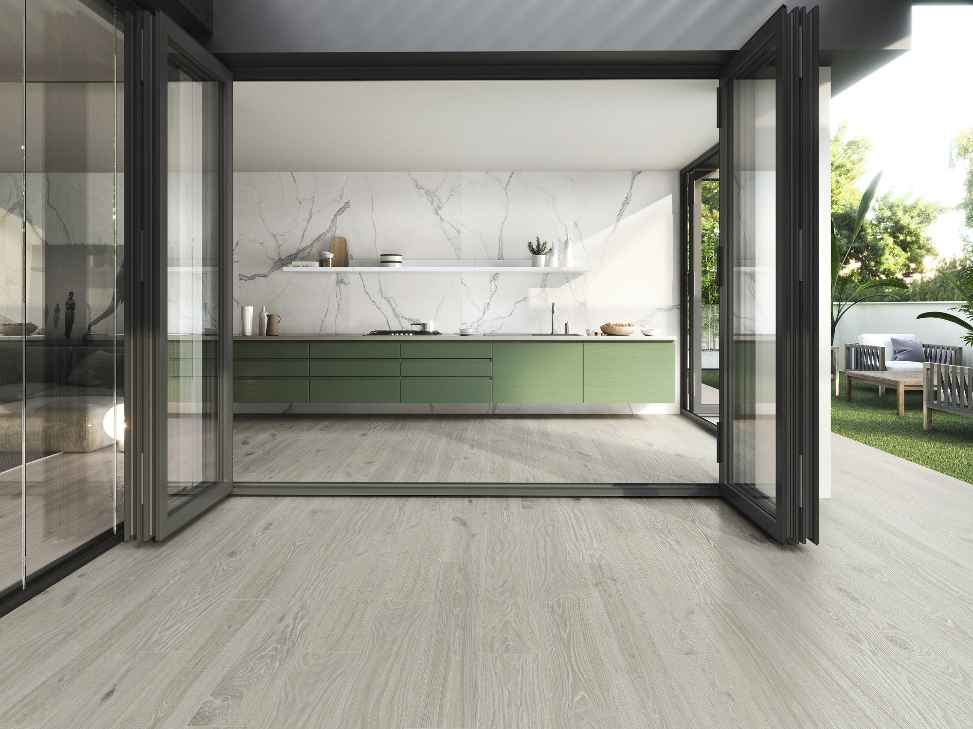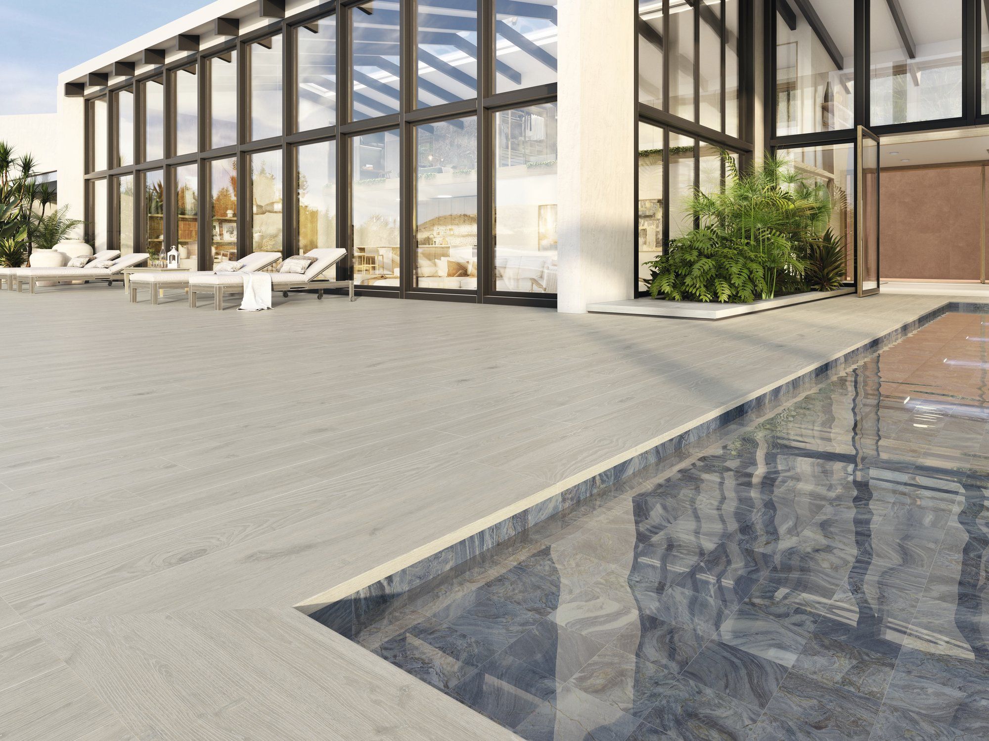 Porcelánico efecto madera 20x120 disponible en C1 y en C3, para poder utilizarlo en toda la vivienda y zona de exterior a juego. Disponible peldaño recto 120x33 para borde de piscina o peldaño de escalera.