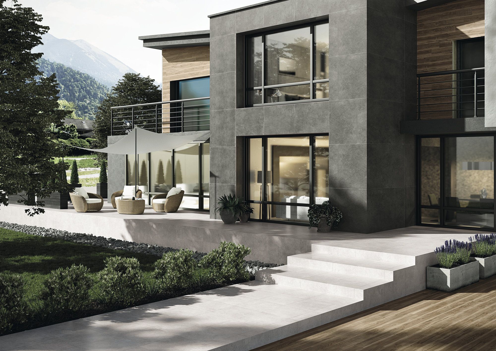 Porcelánico antideslizante C3 rectificado. Disponible en 30,60 60x60 y en 60x120. Dispone de peldaños rectos de 120x33. También existe en acabado Lapatto (no antideslizante) en 30x60 y 60x120.